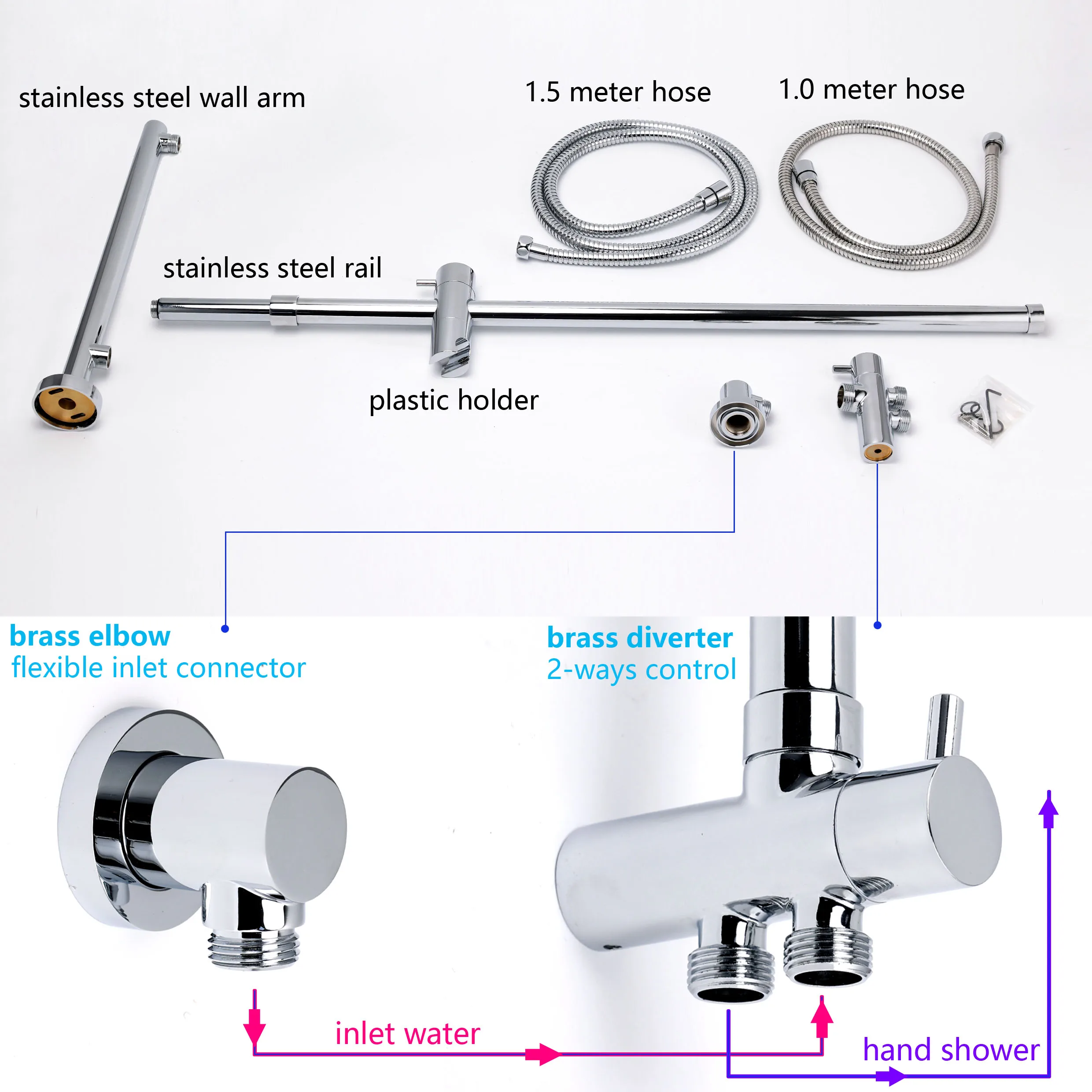 Package Includes: rain shower head+handheld shower+shower rail arm+wall connector+1.5m hose+1.0m hose